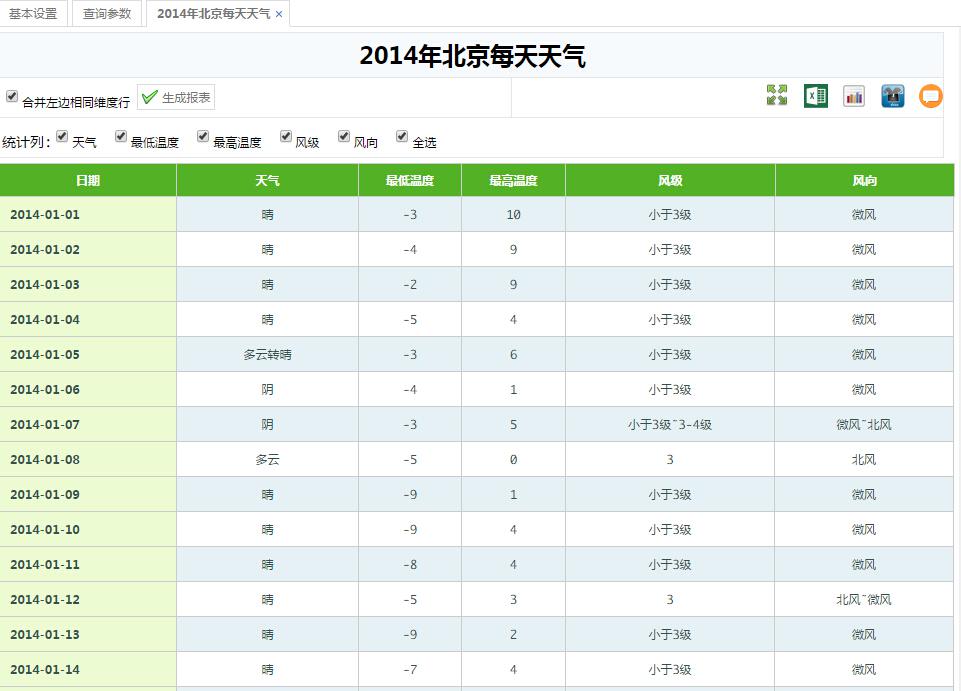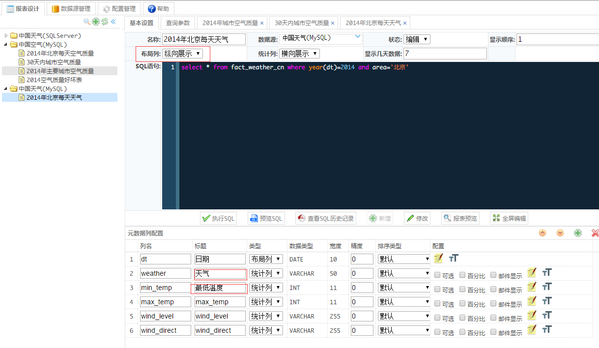 由于列名dt已经在配置管理设置了默认标题,因此在执行SQL后会自动匹配它的标题,您也可以把其他的列名增加配置管理项中,这样下次设计报表时就会自动匹配默认标题。现在看修改后报表展示。
