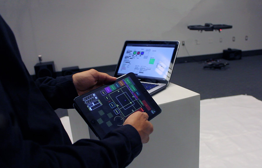The development of this project was initiated by the Transvergent Research Group, including Media Art and Technology graduate student researchers Tim Wood, Sterling Crispin, and RJ Duran. The technology was developed under the direction of Professor Marcos Novak, at the transLAB, housed within the California NanoSystems Institute (CNSI) at the University of California Santa Barbara. ODC originated from experiments within the transLAB’s motion tracking environment using a Parrot AR.Drone at the beginning of 2012. Initially the focus was to create an external Max object which could algorithmically control the drone using available spatial information provided by the OptiTrack system.