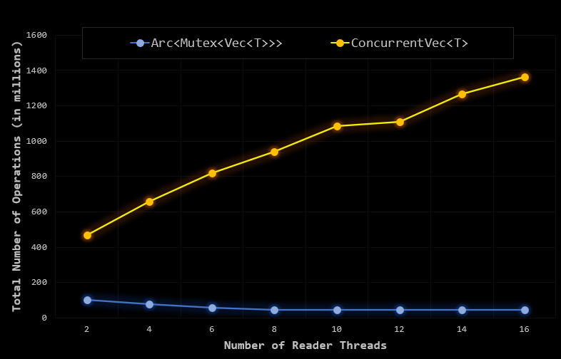 - With 2 reader threads, we observe that lock-free ConcurrentVec is able to perform four times more operations than arc-mutex-vec.