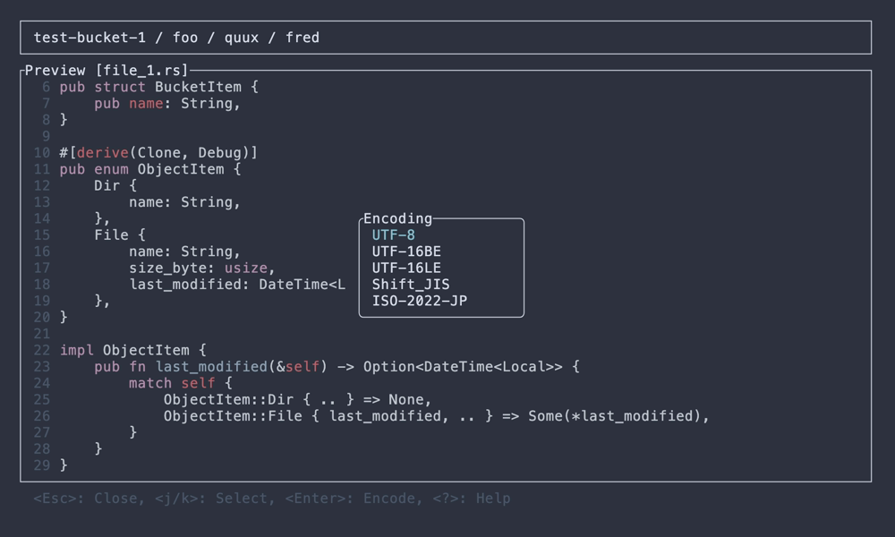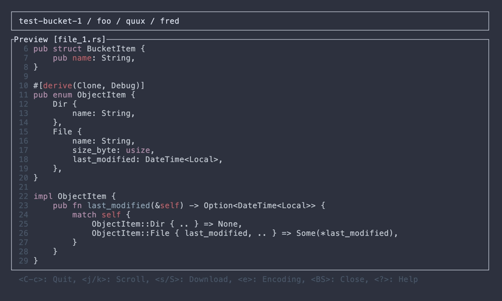 Object Preview Syntax highlighting It must be enabled in the config Image preview It must be enabled in the config Open with encoding Available encodings can be specified in the config Automatic encoding detection (guessing) It must be enabled in the config Download object Download a single selected object Copy the text content to clipboard