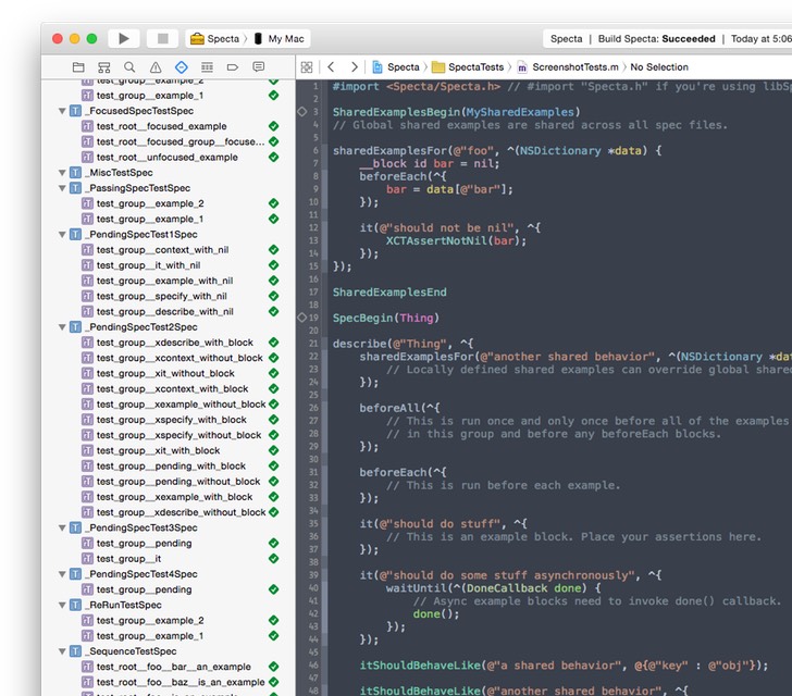 Specta.frameworkinProducts/osxfolder to the test target in your Xcode project. For iOS projects, copy and addSpecta.frameworkinProducts/iosfolder to the test target in your Xcode project. You can alternatively uselibSpecta.a, if you prefer to add it as a static library for your project. (iOS 7 and below require this) - Add