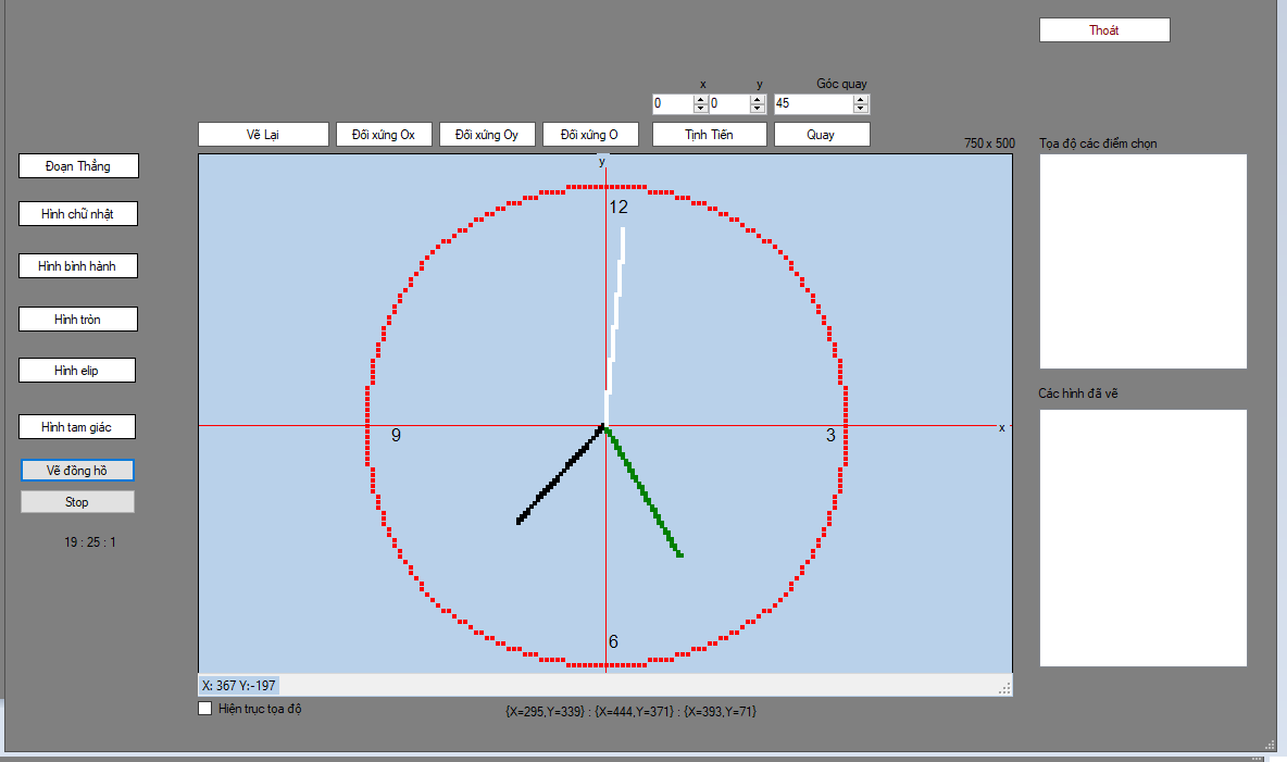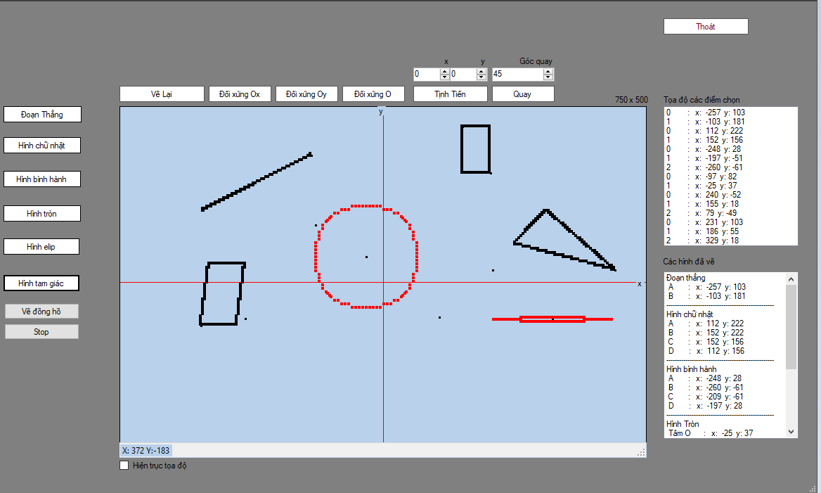 Hiển thị tọa độ của các hình cơ sở trên hệ tọa độ người dùng.
