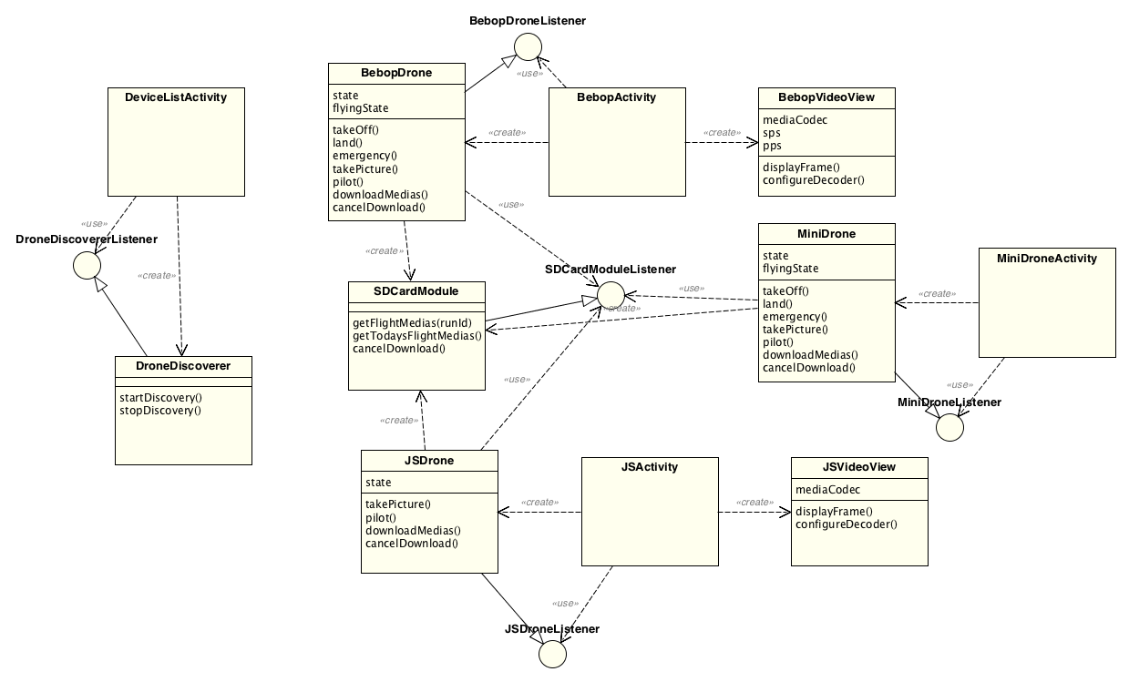 This example enables you to connect to a Bebop drone and send and receive commands to pilot it and get its battery level. It also receives the video stream.
