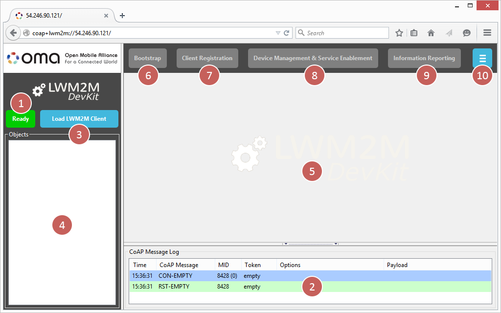 The OMA LWM2M DevKit is an add-on for the Mozilla Firefox Web browser. It adds support for the OMA Lightweight M2M protocol and enables manual interaction with a LWM2M Server directly from the Web browser. This way, developers and users can interactively explore and comprehend the new protocol for machine-to-machine communication.