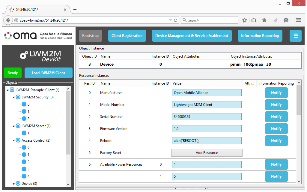 Eto directly load the Example Client. - This area will show the Objects provided by the LWM2M Client. Currently, the eight OMA-label Objects are supported.