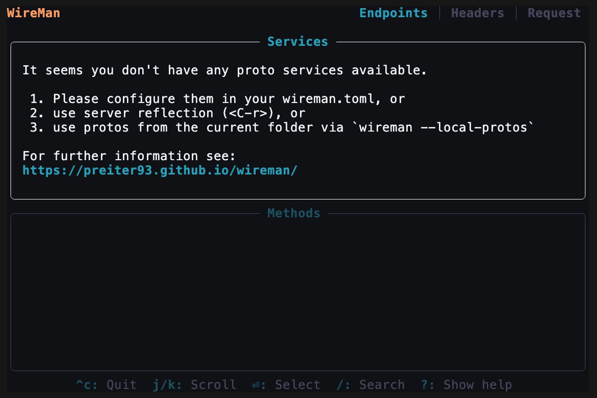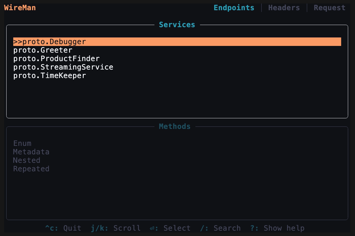 The first page of Wireman will list your grpc services and their methods. You can navigate with
