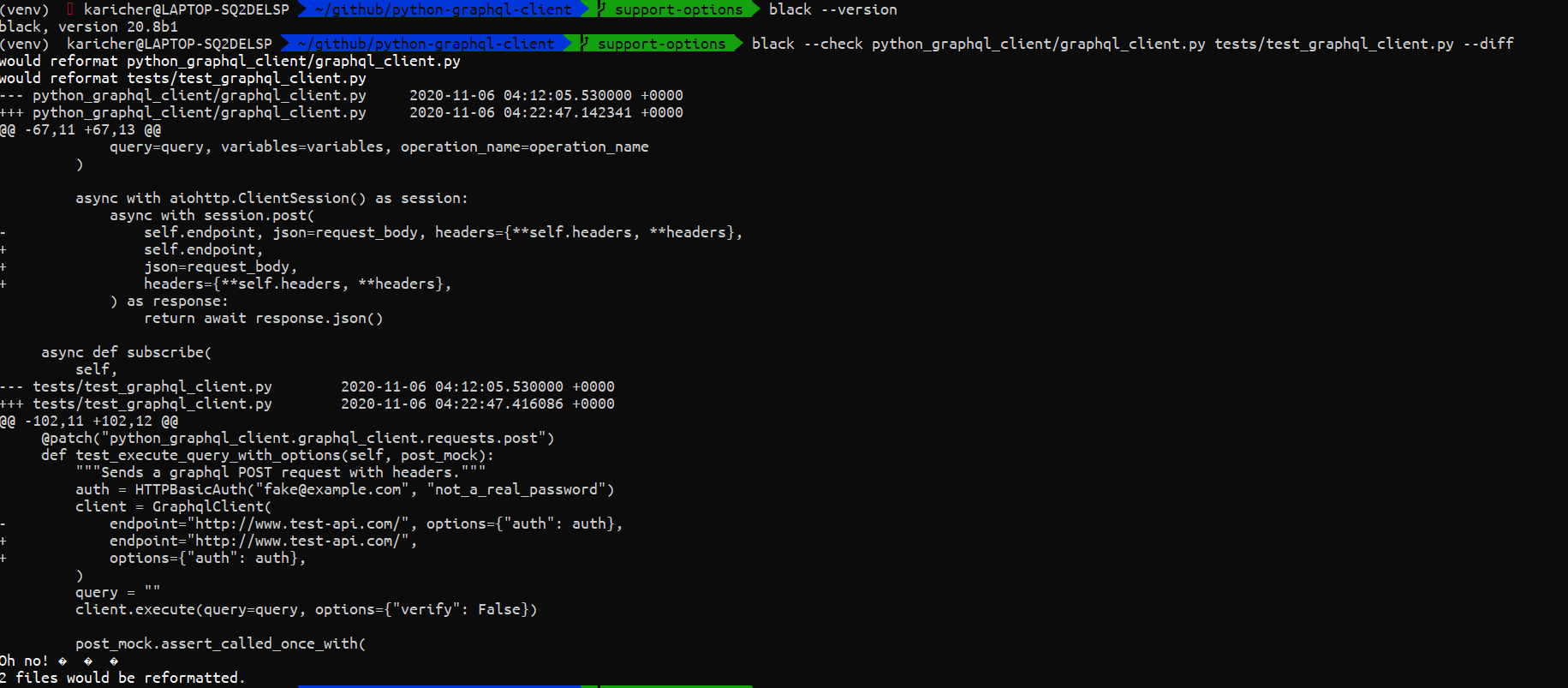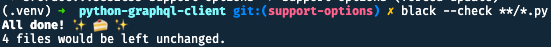 @sreerajkksd Fixed the formatting issues by updating pre-commit hooks so that the same latest version of Black is used by the pre-commit, on my terminal and IDE. ➜ python-graphql-client git:(support-options) ✗ pre-commit autoupdate