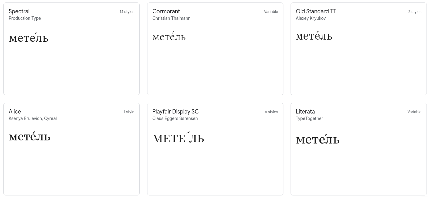 It appears that the rendering of Cyrillic accented letters is not done properly when using Spectral. The problem can be seen, for instance, by comparing Spectral with other fonts on Google Fonts. On the screenshot below, some fonts, such as Cormorant, Old Standard TT and Alice, are doing it correctly. Others, such as Spectral and Literata, are putting the accent too much to the right. Others, such as Playfair Display SC, are completely messing up both the position of the accent and the spacing.