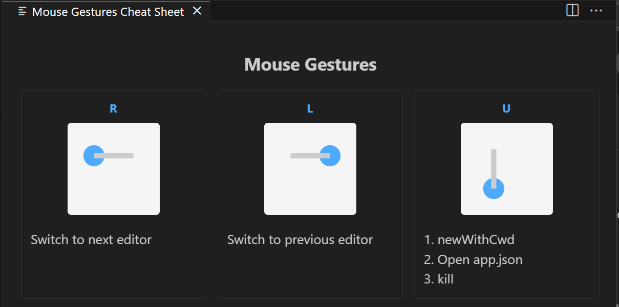 Use the "Mouse Gestures: Show Cheat Sheet" command from the command palette (Ctrl+Shift+P) to view all configured gestures in a visually organized cheat sheet. The cheat sheet now groups gestures by their associated command descriptions, making it easier to find and understand your configured gestures. The cheat sheet displays: