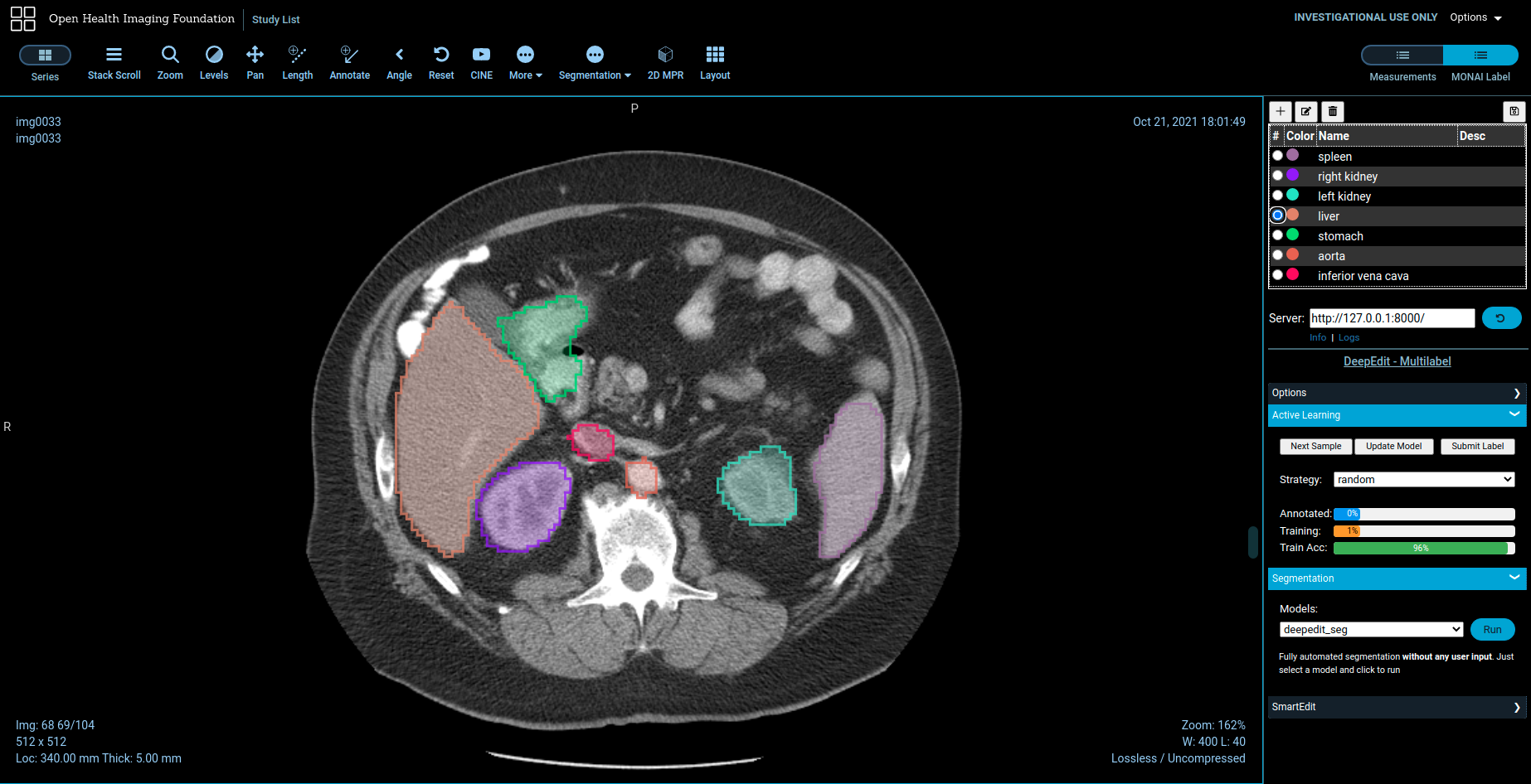 monailabel start_server --app apps/radiology --studies http://127.0.0.1:8042/dicom-webOHIF Viewer will be accessible at http://127.0.0.1:8000/ohif/