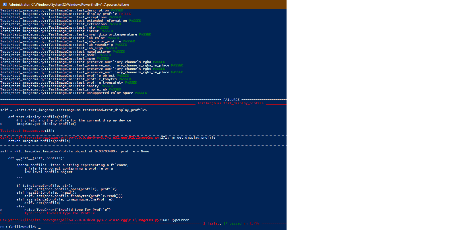 test_grabfailure is reasonable, the other test fails with a TypeError raised fromImageCms.get_display_profile, which is confusing at best. This is caused byImageCms.core.get_display_profile_win32returning None, which is obviously not accepted by theImageCmsProfileconstructor. This PR proposes returning None instead (in accordance with the functions docs).