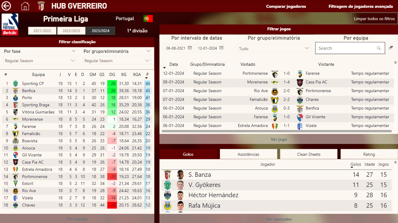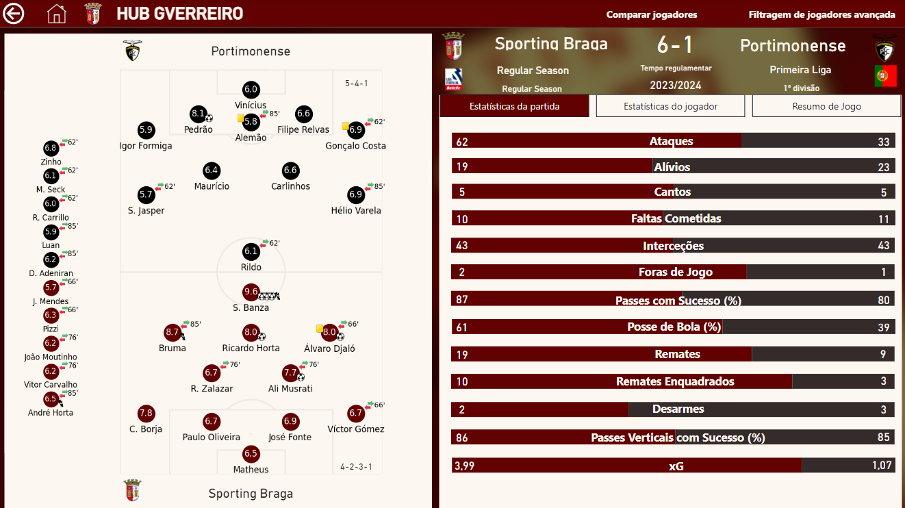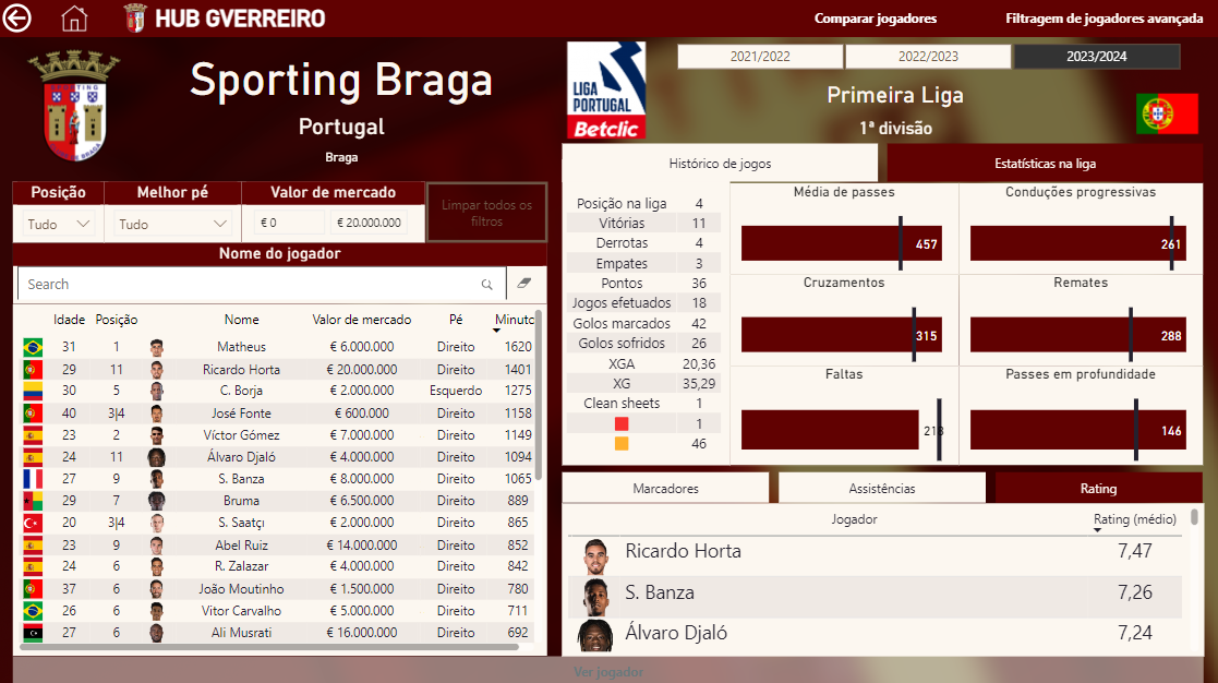 Hub Gverreiro - SCB ScoutingPlatform This project involved creating dashboards using WyScout API data in Microsoft PowerBI for Sporting Clube de Braga. Below are some of the pages created in the project:
