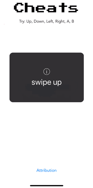 let actionSequence: [CheatCode.Action] = [.swipe(.up), .swipe(.down), .swipe(.left), .swipe(.right), .keyPress("a"), .keyPress("b")]Once the sequence of actions has been defined, instantiate a Cheat and optionally provide a callback which will be invoked to feedback the user's progress as they complete the sequence of actions required to unlock the cheat: