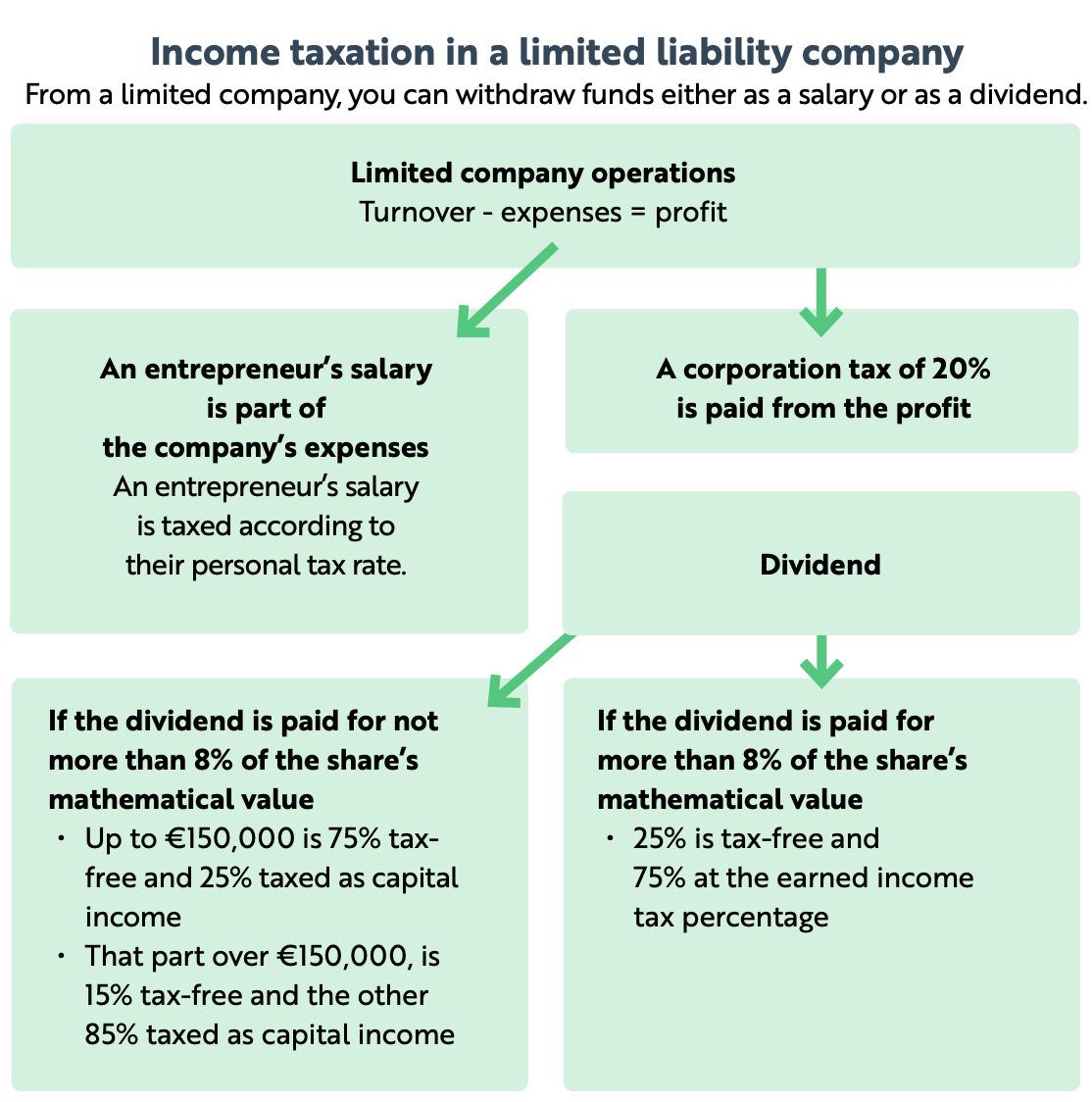 - If you offer yourself 1,000โฌ as salary, and your tax rate is 35%, you pay 350โฌ in taxes.