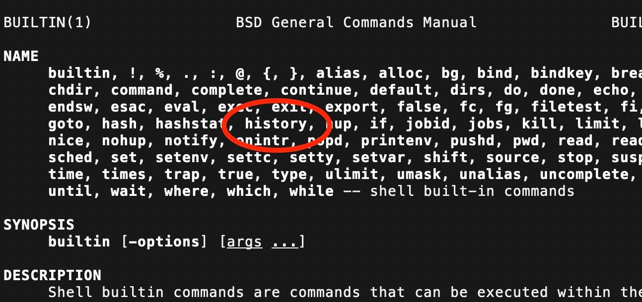 % man historyunfortunately does not reveal much that is helpful. The history command is built in to the shell - as are many other commands: