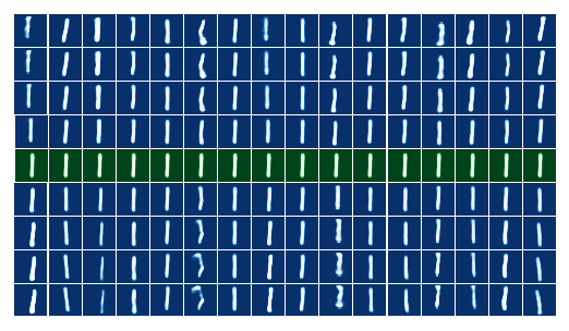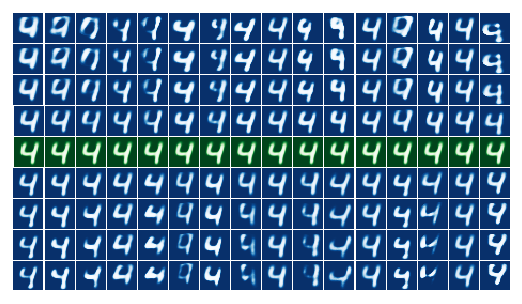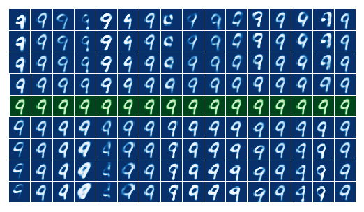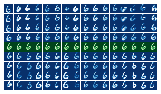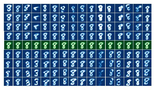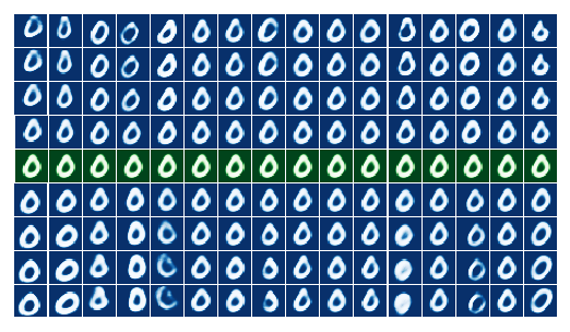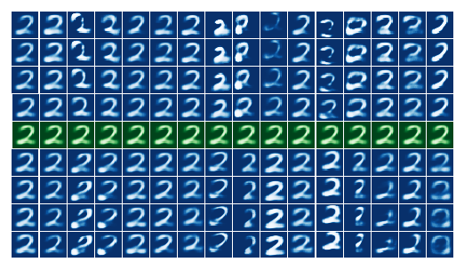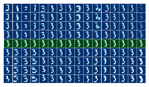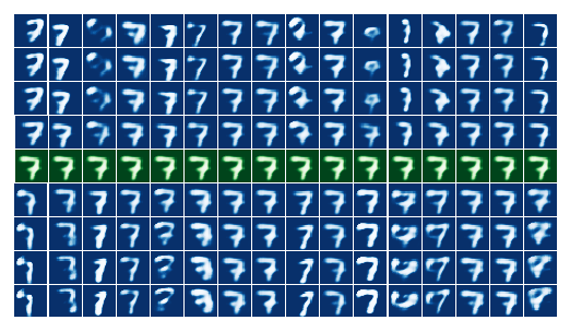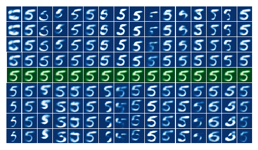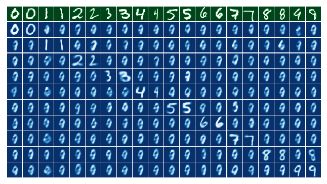 The top green images are real images which are given to the model. Blue images in i-th represents reconstructed ones of digit "i".