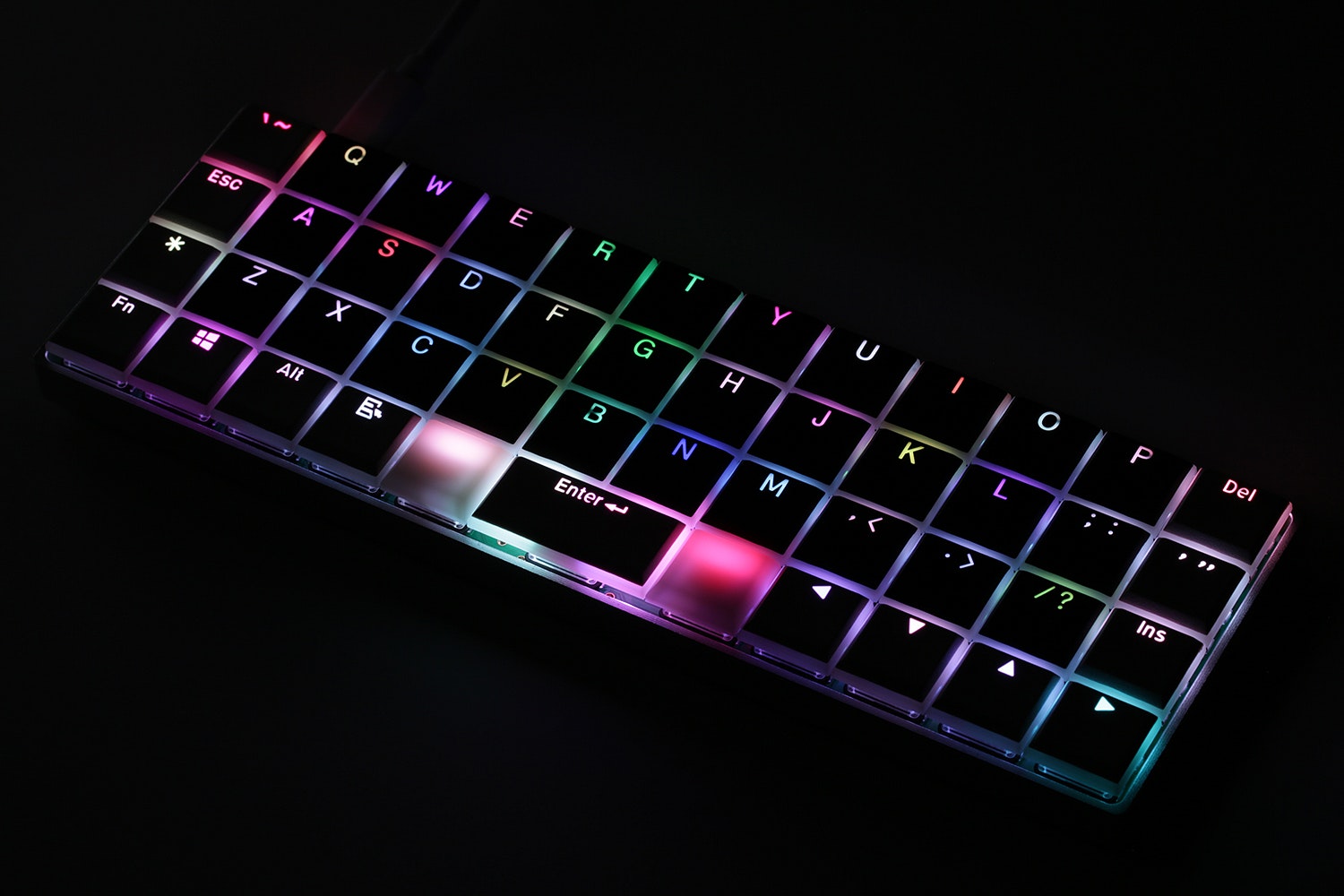 A Planck variant sold by Massdrop. Designed for Kailh PG1350 "Choc" switches, the Planck Light Features per-key RGB backlighting and a dual-channel speaker. More info on qmk.fm