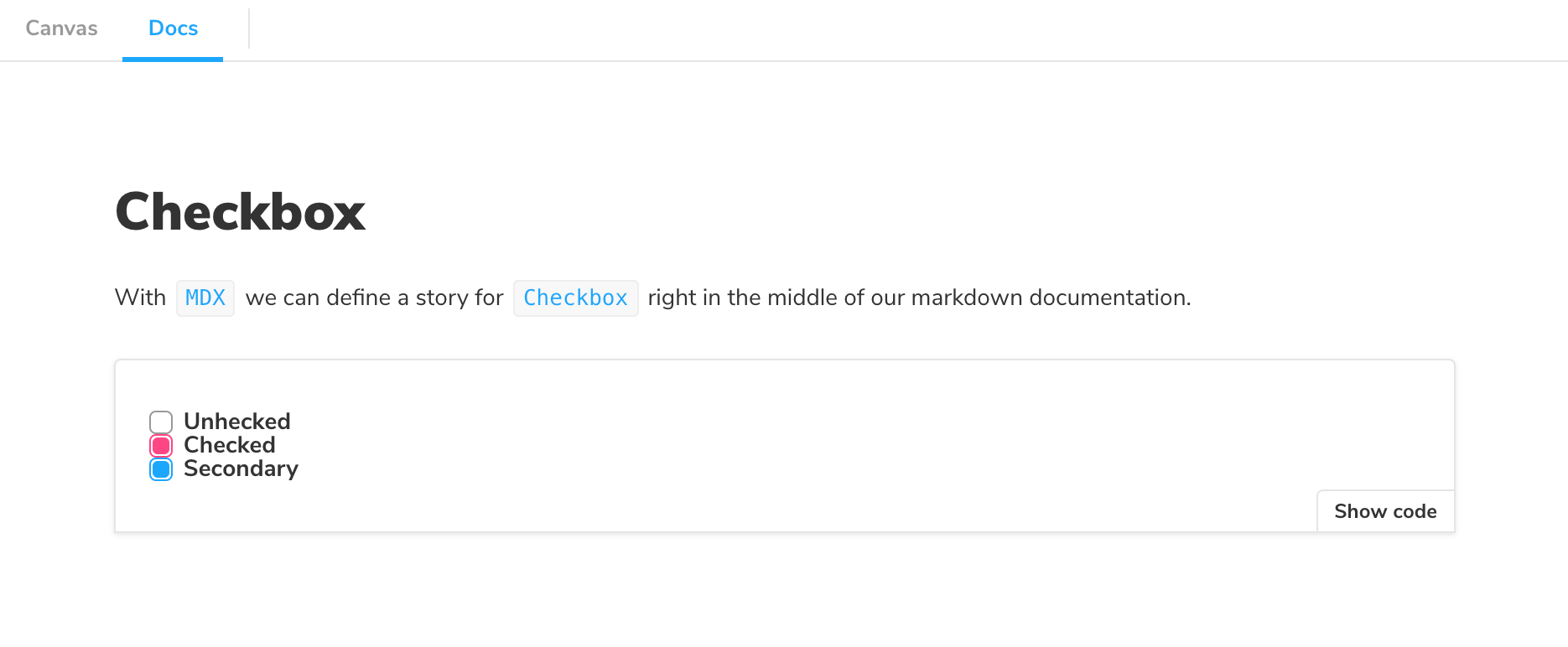 With `MDX` we can include a story for `Checkbox` right in the middle of our