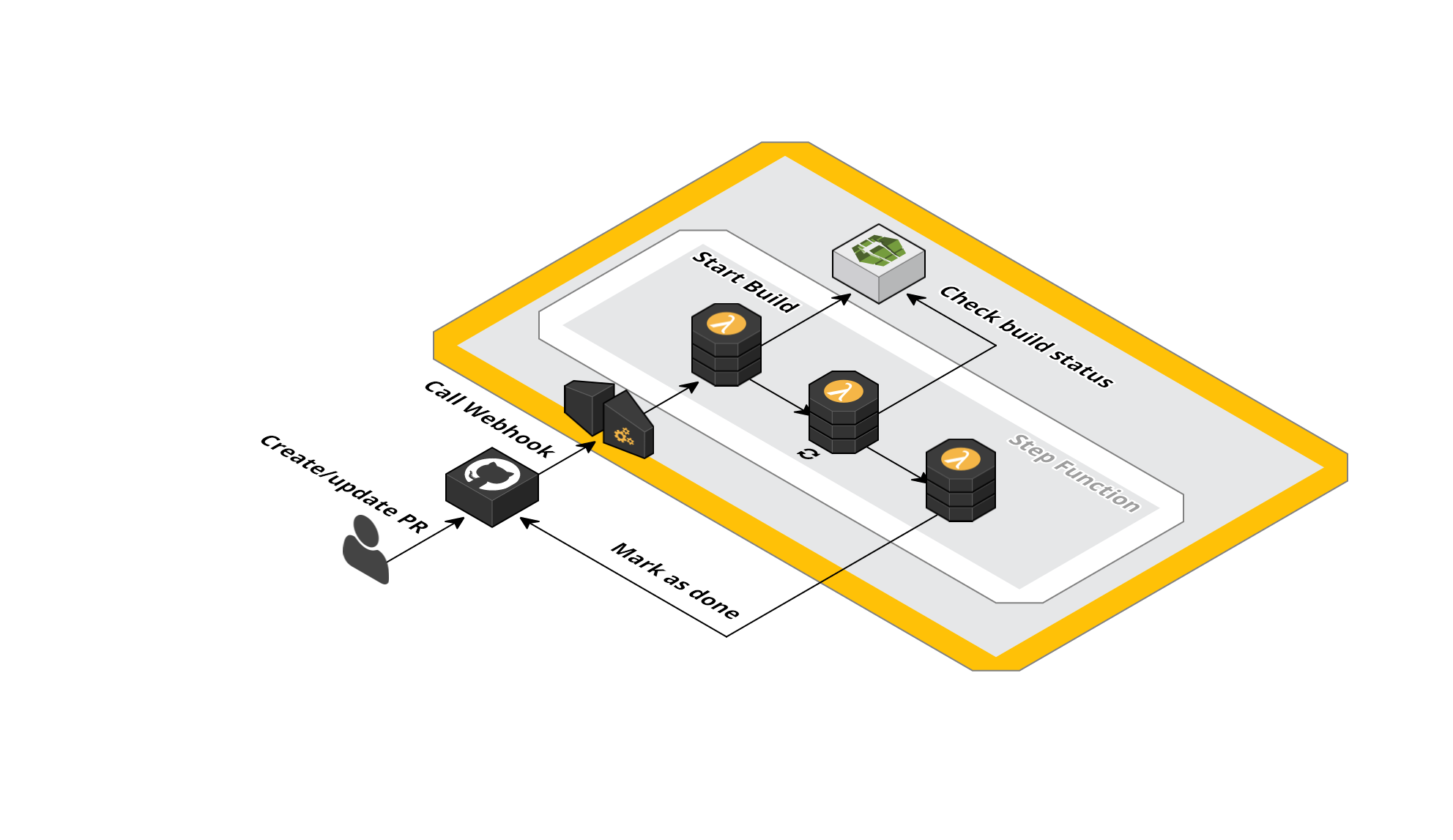 When you create a PR, a notification is send to the Api Gateway endpoint and the lambda step function is triggered. This will trigger the start of a build for your project, and set a status of pending on your specific commit. Then it will start checking your build status every X seconds. When the status of the build changes to done or failed, the github api is called and the PR status will be updated accordingly.