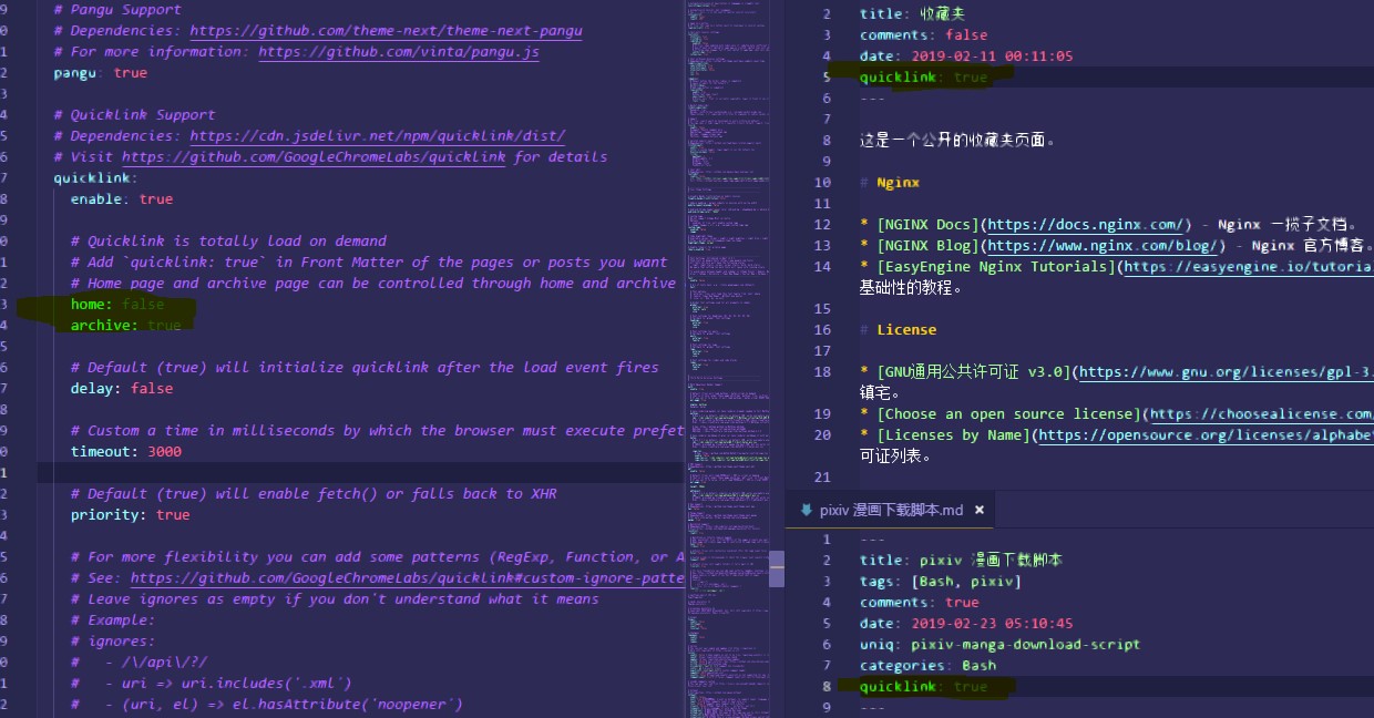 @ivan-nginx It won't, in previous version we can globally load quicklink but couldn't control home and archive page fully, so I commit this PR. I think editing scaffolds/page.md or post.md is good. ---