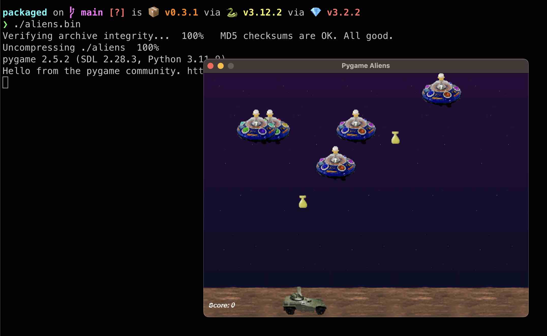 packaged ./aliens 'pip install pygame' 'python -m pygame.examples.aliens'Another one that you can try out is pygame.examples.chimp.