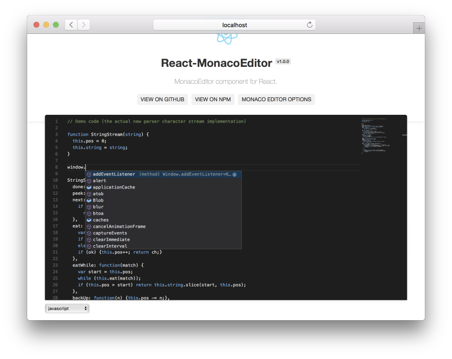 widthwidth of editor. Defaults to100%.heightheight of editor. Defaults to100%.valuevalue of the auto created model in the editor.defaultValuethe initial value of the auto created model in the editor.languagethe initial language of the auto created model in the editor.themethe theme of the editorvs,vs-dark,hc-blackoptionsrefer to Monaco interface IEditorConstructionOptions.editorDidMount(editor, monaco)an event emitted when the editor has been mounted (similar tocomponentDidMountof React).onChange(newValue, event)an event emitted when the content of the current model has changed.autoComplete?: (model: monaco.editor.ITextModel, position: monaco.Position) => languages.CompletionItem[];User provided extension function provider for auto-complete. #47