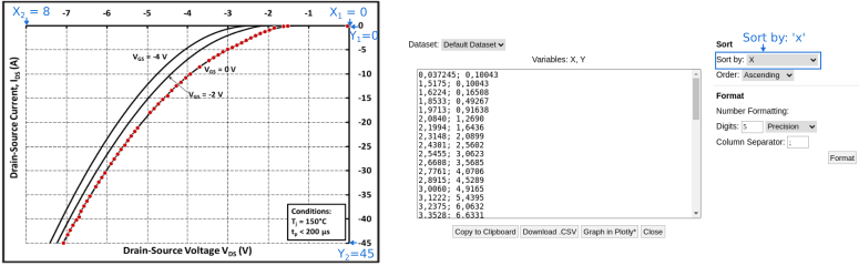 Channel data for switch and diode always needs to be positive. Some Manufacturers give diode data in the 3rd quadrant. Here is an example how to set the axes and export the data inside WebPlotDigitizer: