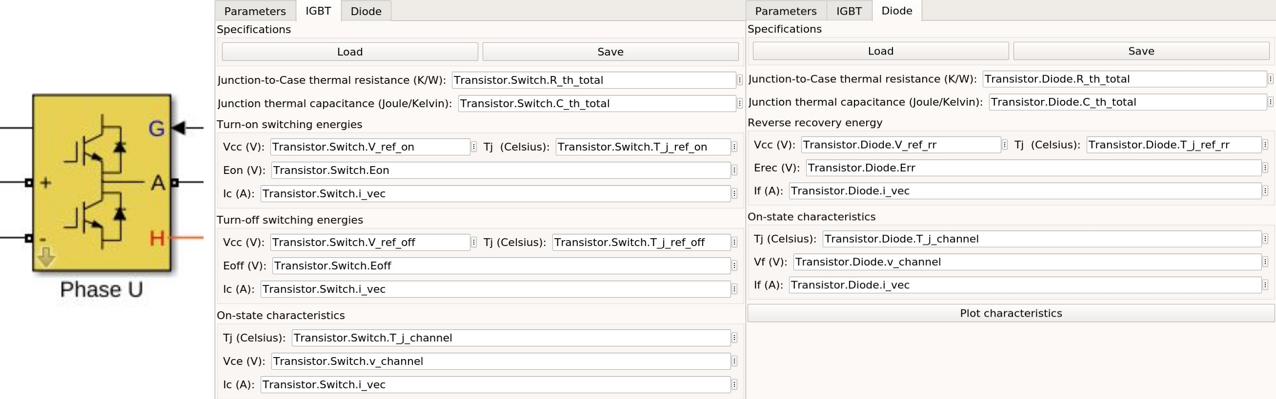 For a loss simulation in simulink, there is a IGBT model available, which can be found in this simulink model . Copy the model to you schematic and fill the parameters as shown in the figure. Export a transistor object from your database by using the following command. Example for a Infineon transistor. .. code-block: