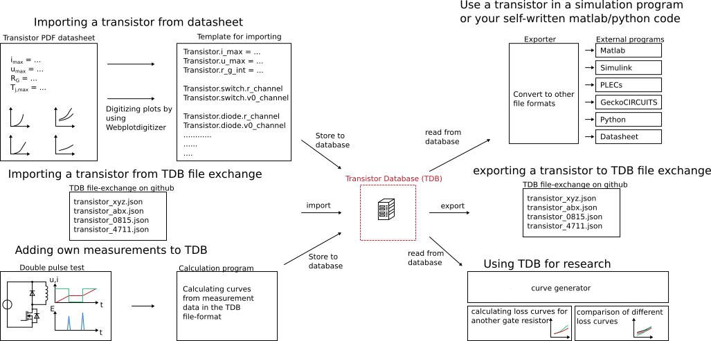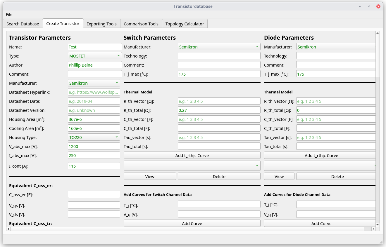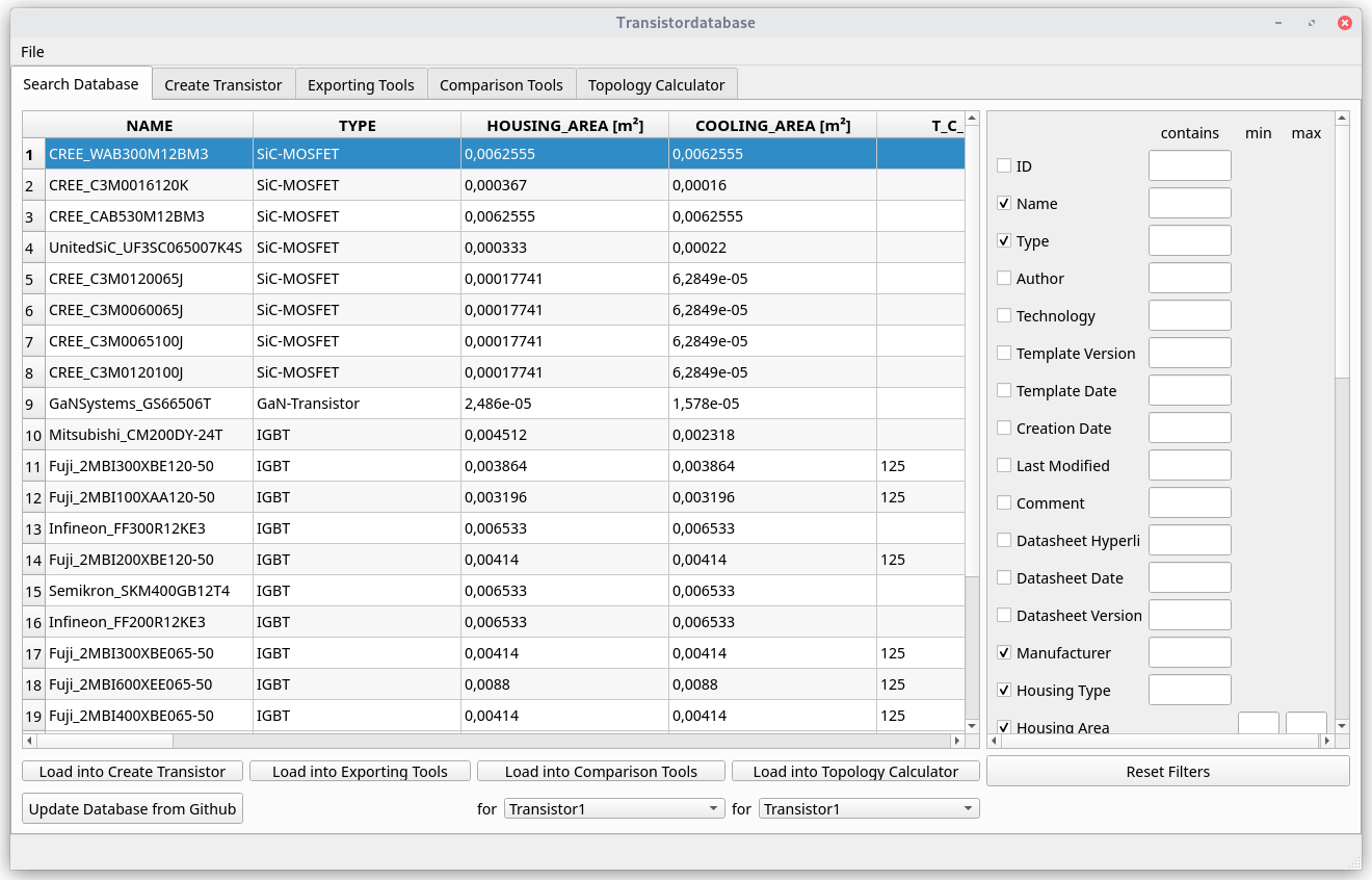The Transistordatabase is a tool developed by LEA from the University Paderborn which helps working with choosing transistors for the developement of electronics. When it comes to the point of choosing a transistor, there is typically a lot of trouble with different programs. Often there are multiple programs for calculating transistor parameters and a schematic simulator to verify the results. Now your colleague is working on a different electronics topology and may use different programs. This is a problem because in most cases your transistors will never be compatible with the ones from your colleague. The Transistordatabase now solves this problem: Here Transistors can be saved in a database and makes them easy to interchange between platforms. It is possible to export Transistor data to various simulation software and share it to a colleague using a .json-File.