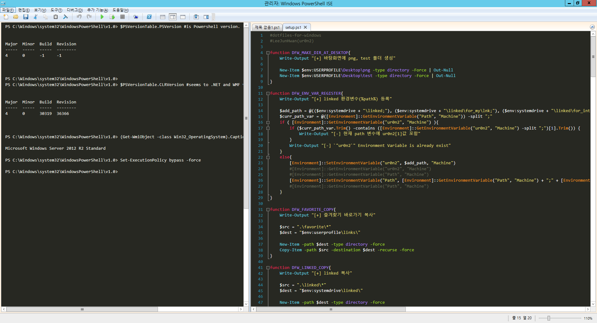powershell -nop -command "start-process powershell -verb runas -argumentlist {-command IEX (New-Object Net.WebClient).DownloadString('https://raw.githubusercontent.com/ur0n2/dotfiles-for-windows/master/using-git.ps1')}"Git-less installation.