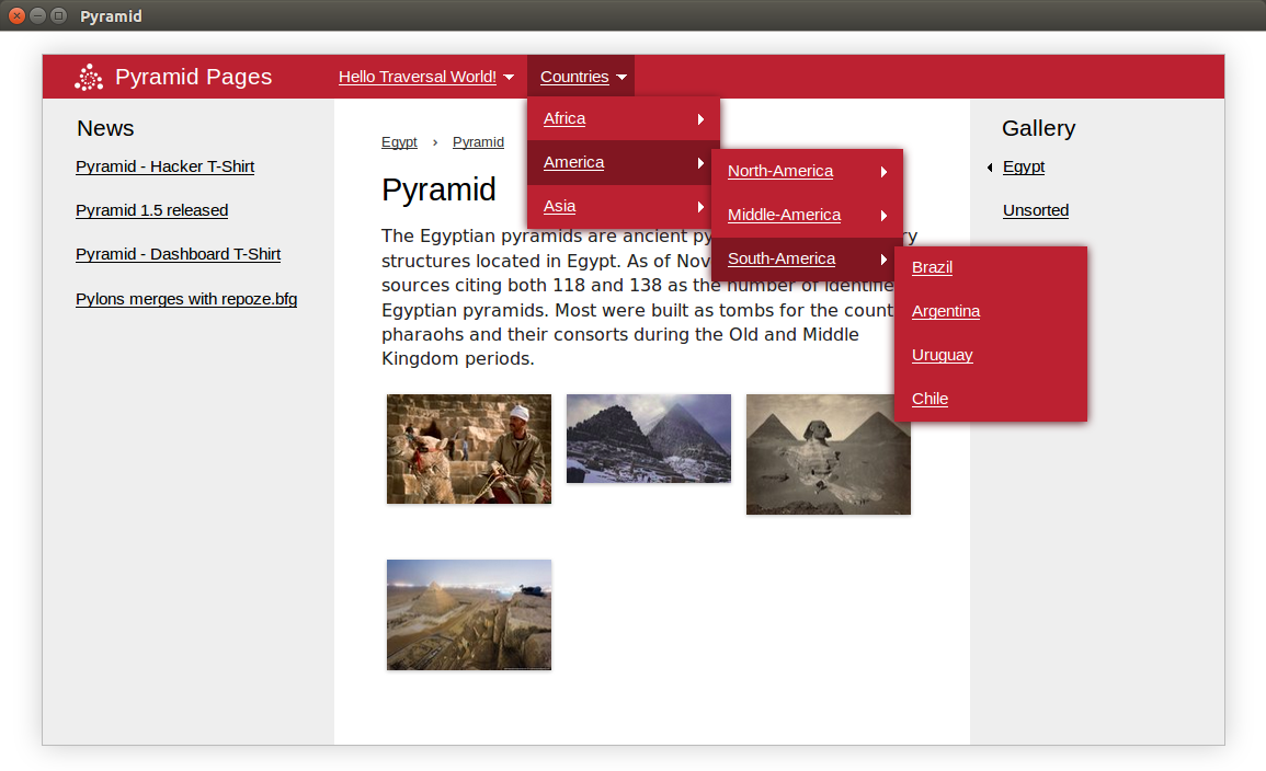 pyramid_pages provides a collections of pages to your Pyramid application. This is very similar to django.contrib.flatpages but with a tree structure and traversal algorithm in URL dispatch.