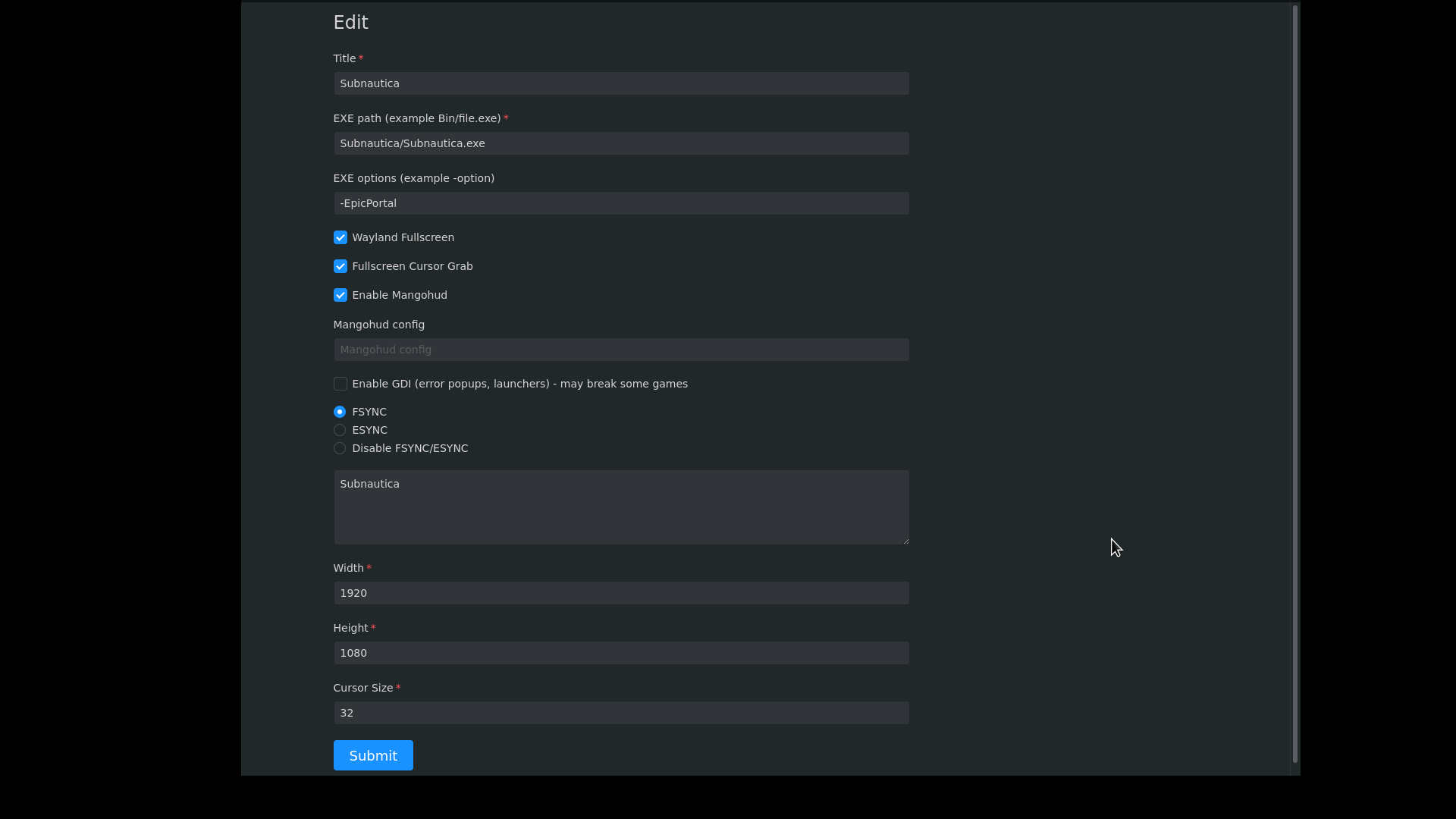 "your-game" above should be lowercase, no spaces tag. For example, for Subnautica it would be subnautica. Then go to your launcher, click on the blue joystick icon. In the browser tab, click Edit below the card for your-game. Enter name for your game, YourGameFolder/game.exe for exe path. And -EpicPortal for game options (for EGS games). Set mangohud and other options as needed. See below screenshot for example of options for Subnautica.