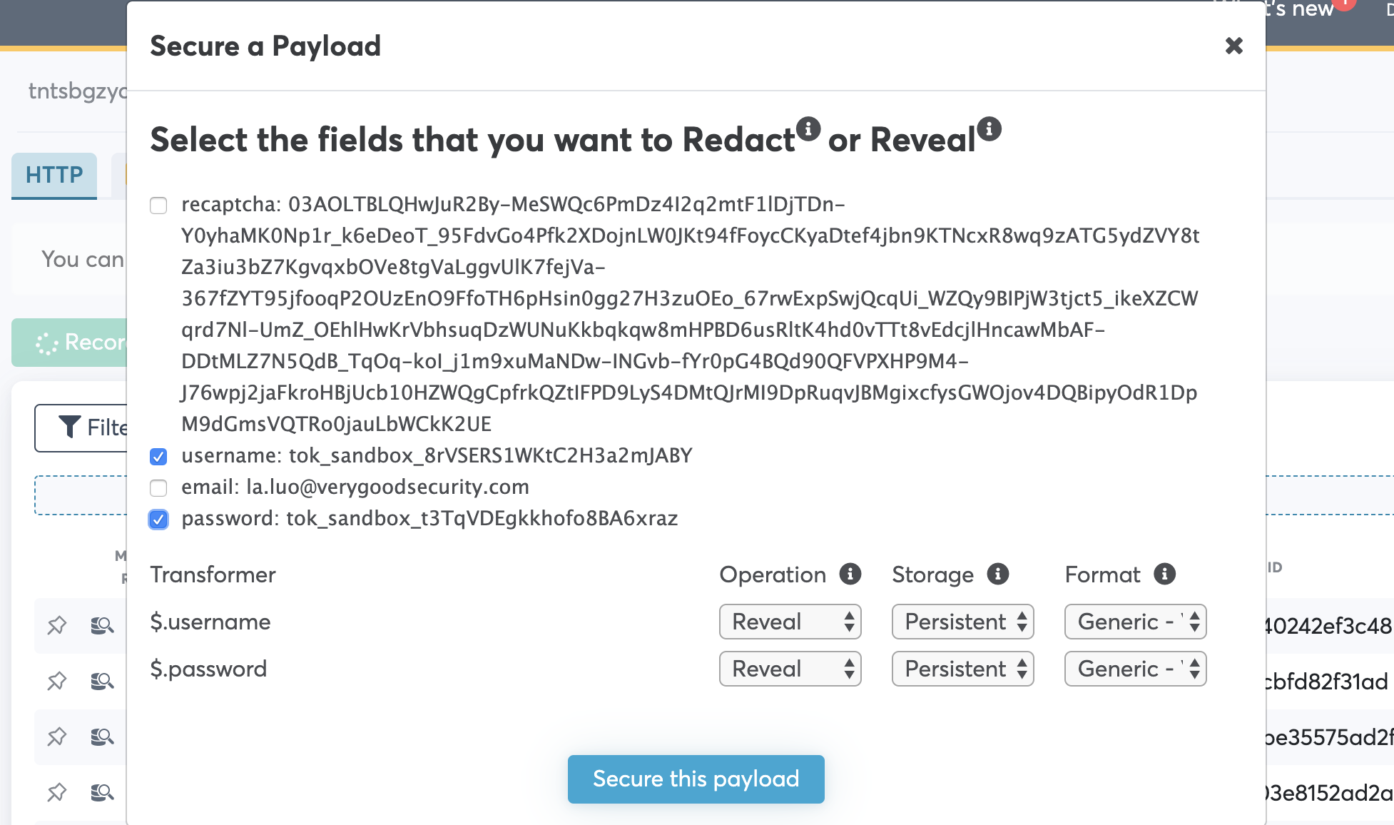 - Run the app again and find the corresponding request to submit the form in logger, you will find the VGS aliases have been revealed to the original credentials