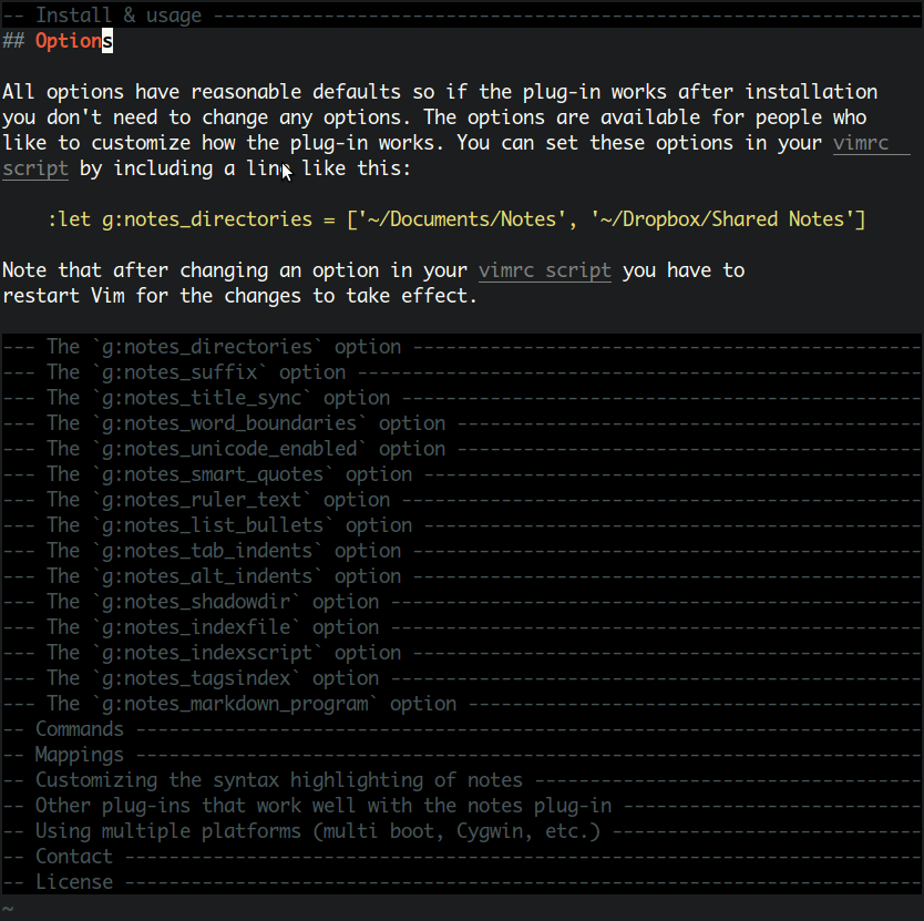 - Navigating within notes: The vim-notes syntax uses atx-style headers just like Markdown markdown (one to six