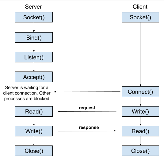 accept() 이후 서버는 클라이언트에서 연결 요청이 올 때까지 blocking 상태를 유지한다. 클라이언트에서 연결 요청이 들어오면 3-way handshake 를 통해 호스트간 Connection 을 생성한다.