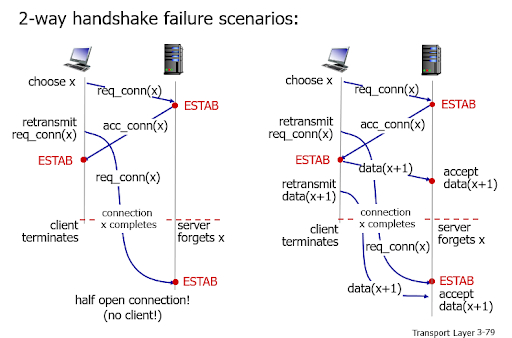 - half open connection : 2-way handshake에 발생하는 문제점