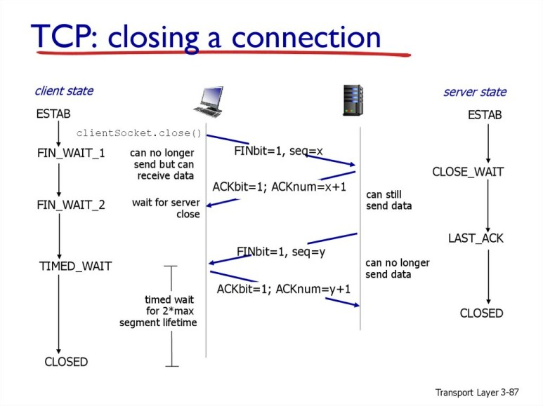 ※ 예시에서 클라이언트가 ACK을 보내더라도 얼마간 time wait 를 유지한 후 커넥션이 끊어진다. 만약 client가 마지막으로 보낸 ACK가 손실되면 서버는 timeout 되어 FIN segment를 재전송 할 것이기 때문. (클라이언트는 wait상태에서 ACK 재전송할 수 있음.)