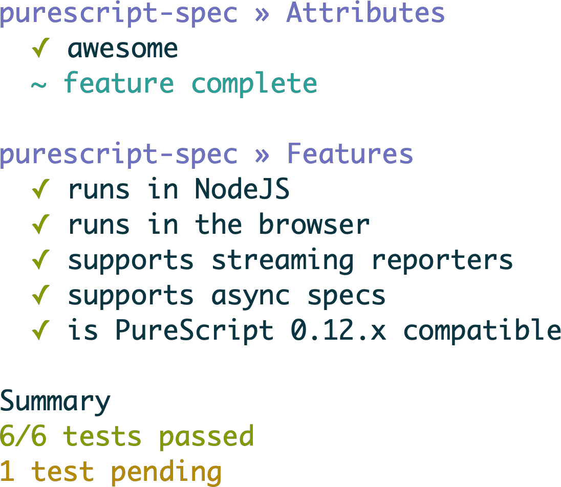 - PureScript Spec - The Guide explains in detail how to use purescript-spec. You should probably start here.