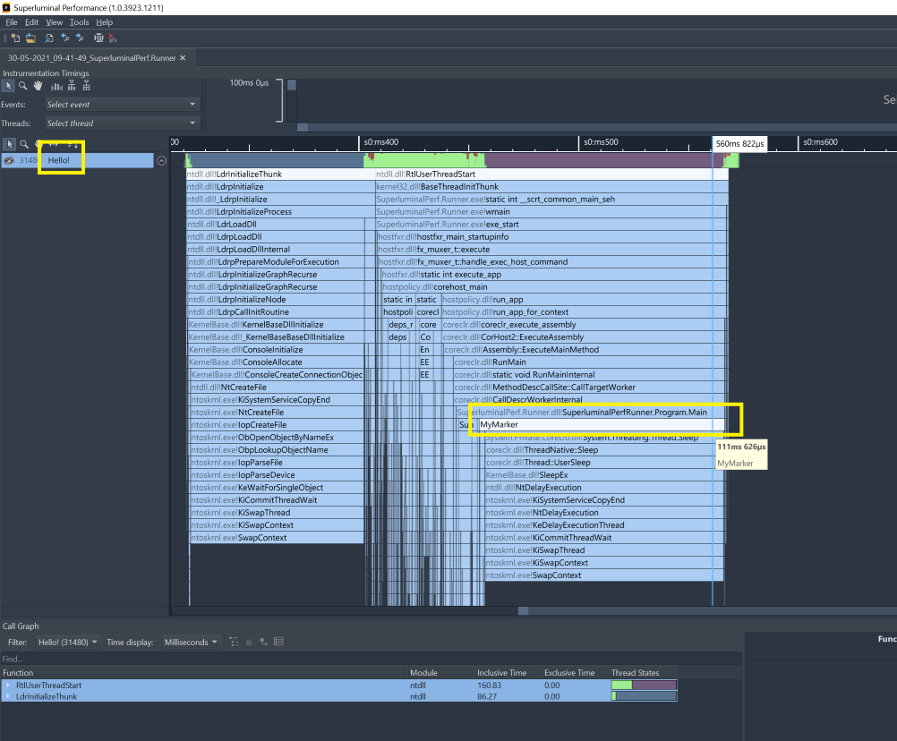 SuperluminalPerf.EndEvent();Running with Superluminal will produce the following markers: