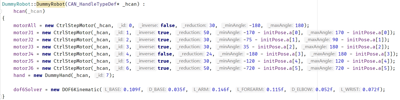 DummyRobot类是Dummy的完整定义所在,初始化的时候需要设置好步进电机驱动的信息以及自身的DH参数: